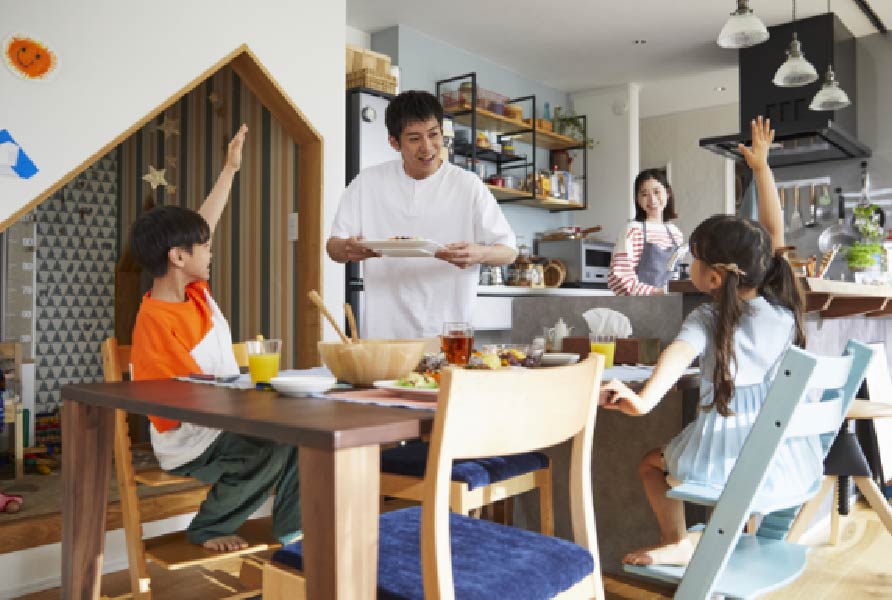 カウンターを設けたキッチンは家族が集まりやすい場所のひとつ。 ママ・パパは食事の準備しながら、子どもは宿題をしながら、自然と会話が弾みます。
