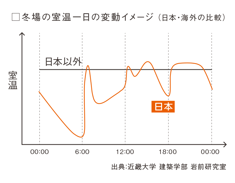 欧米では、室内は一日中暖かくしておくのが一般的。日本には就寝時に暖房を止めてしまう習慣があり、冷たい空気が肺や身体の冷えにつながって健康に影響をもたらすのです。