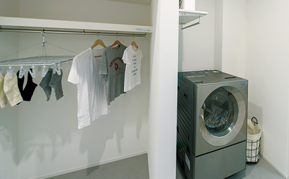 脱衣所+洗濯機置き場+室内物干し場と多機能なランドリールームは、脱ぐ~洗う~干すがここで完結。洗面と脱衣所を分けることで、お互いの生活リズムをじゃますることなくストレスフリーに。