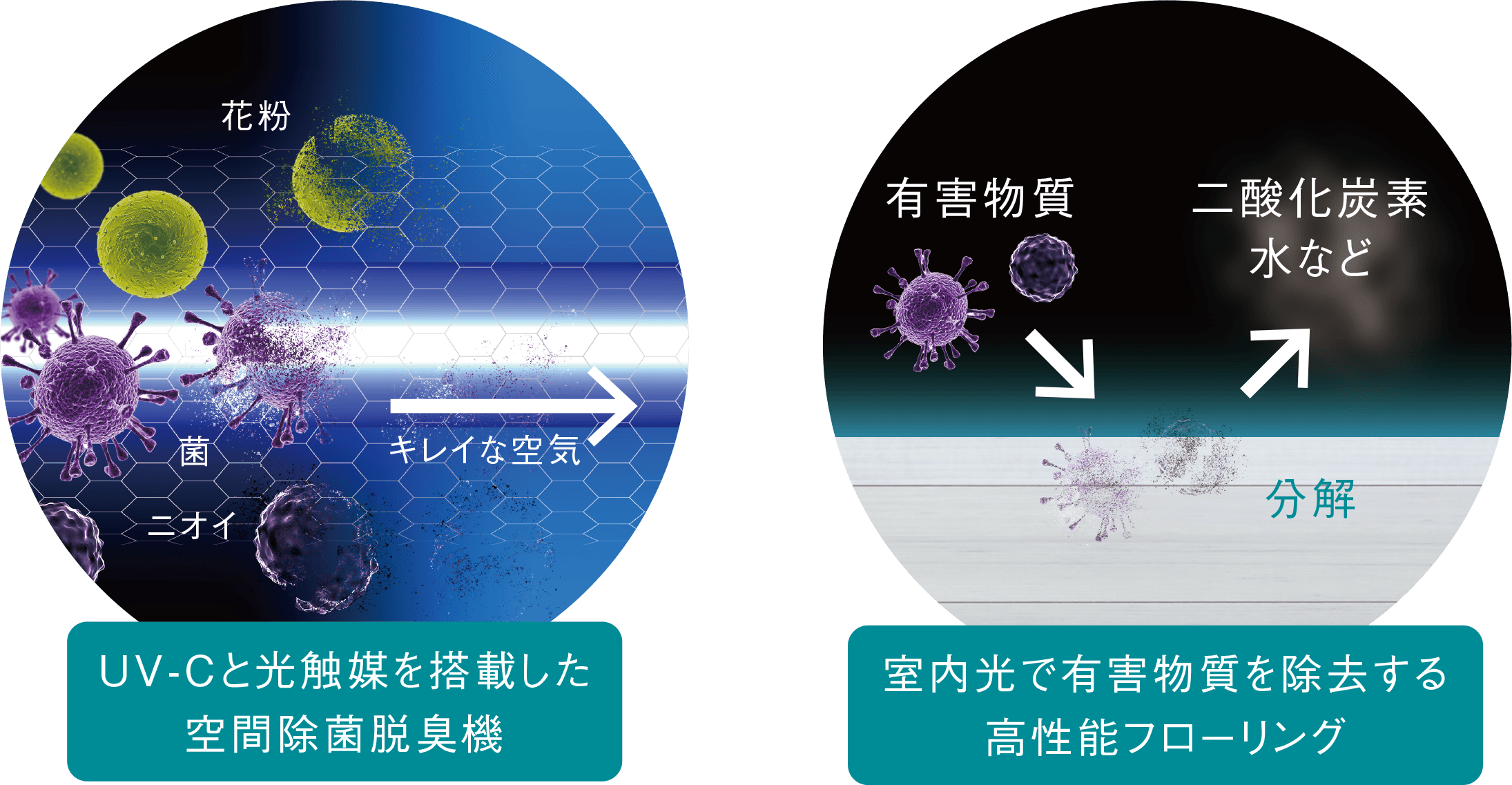蛍光灯やLEDなどの室内光により、床に付着・蓄積する菌・カビ・ウイルス、臭いやVOC(揮発性有機化合物)等を分解できる先端技術“可視光応答型光触媒”で室内環境を清潔にするフローリング「清潔すこやかフロア」を採用。美しい木の風合いを再現しつつ優れた機能性を持つシートフロアが、足元から家族の安心・安全・健康・快適を見守ります。