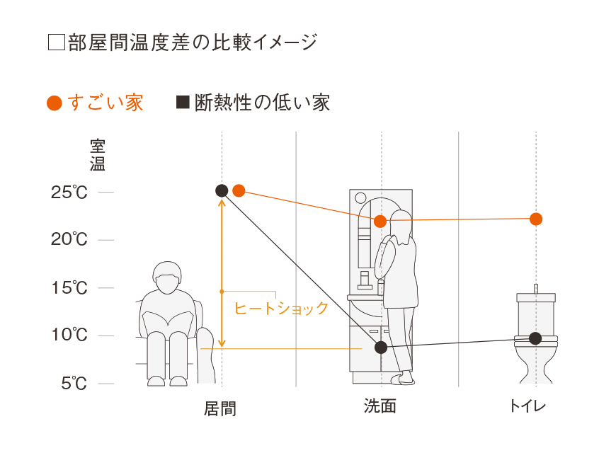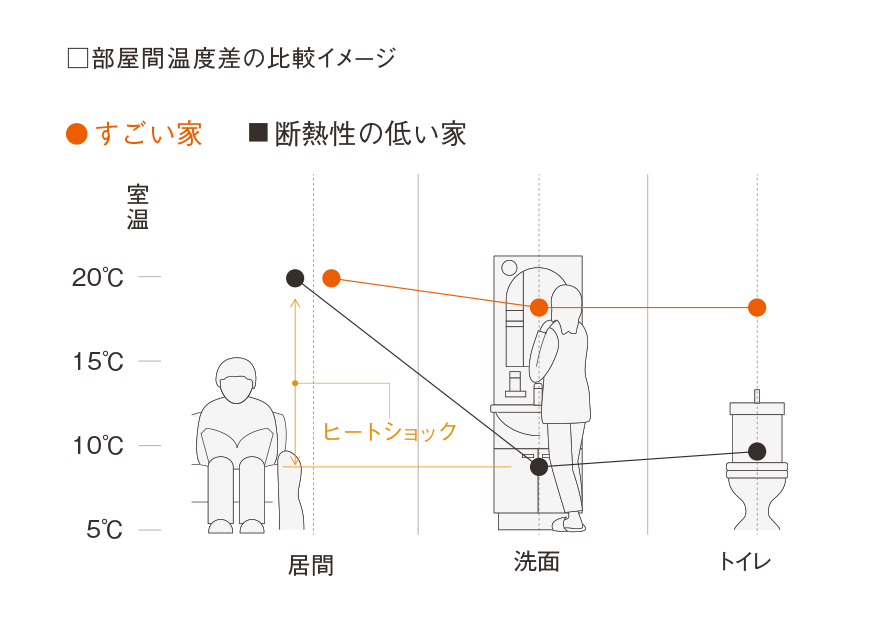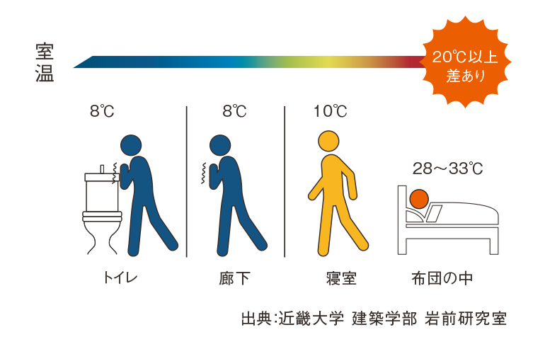 冬の深夜、布団の中が30℃、室温が10℃とすると、起き上がって布団を出たとたんに20℃の温度差を感じ、廊下やトイレはさらに寒くなります。この温度差によるヒートショックこそが健康の大きなリスク。日本でのヒートショックに関連した死者数は2011年の1年間で約17,000人と推計されています。