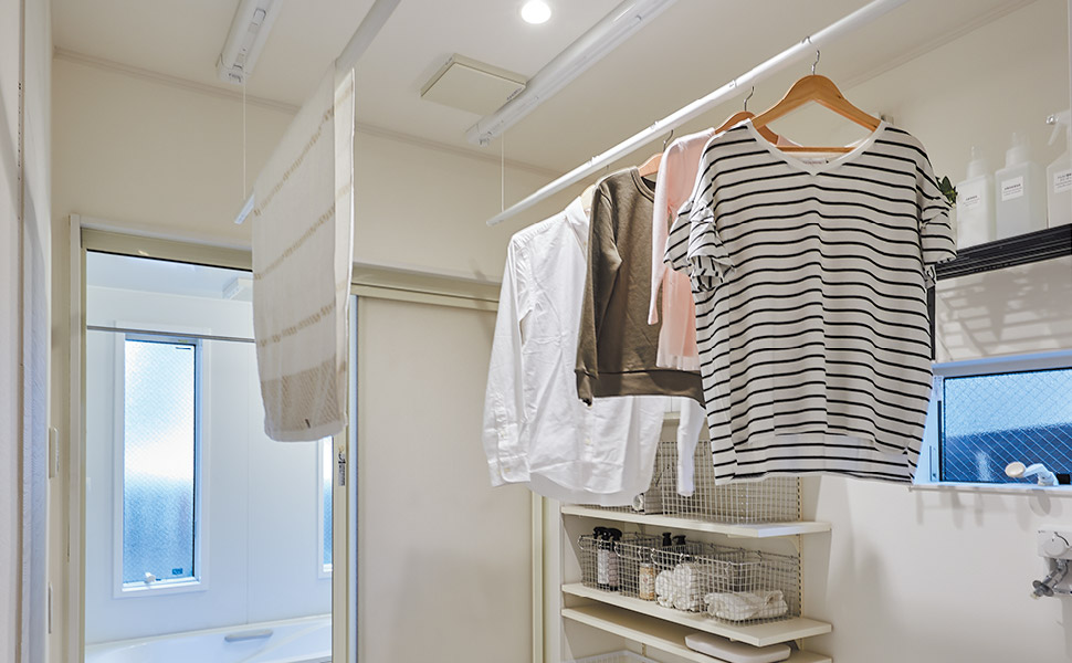 脱衣所+洗濯機置き場+室内物干し場と多機能なランドリールームは、脱ぐ~洗う~干すがここで完結。洗面と脱衣所を分けることで、お互いの生活リズムをじゃますることなくストレスフリーに。