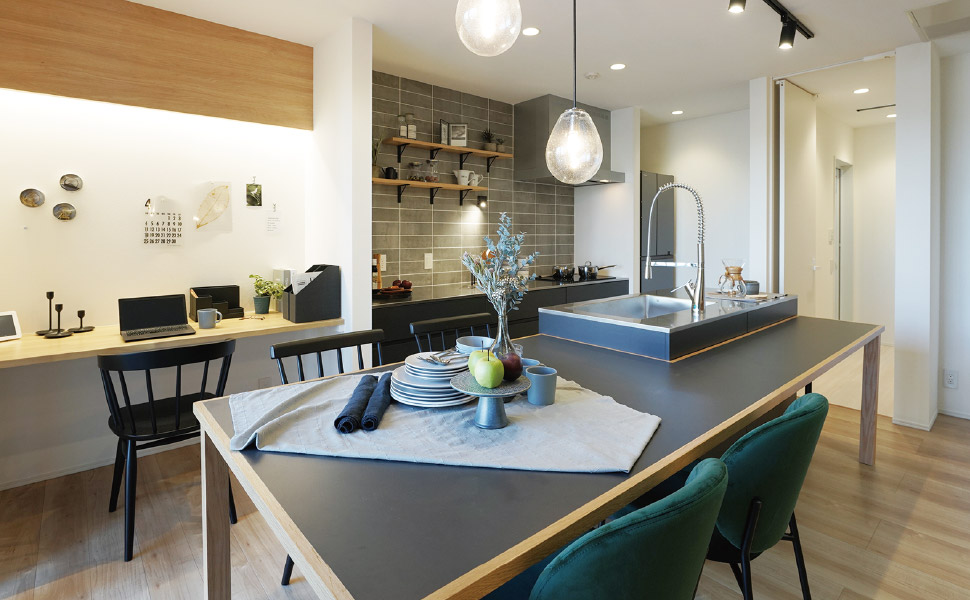 シンクとコンロを分けた二型キッチンは、家族で立っても余裕の広さ。シンクはリビングが見渡せる対面アイランド型に。ダイニングテーブルをつなげることで、料理や配膳、後片付けがぐんとラクになります。