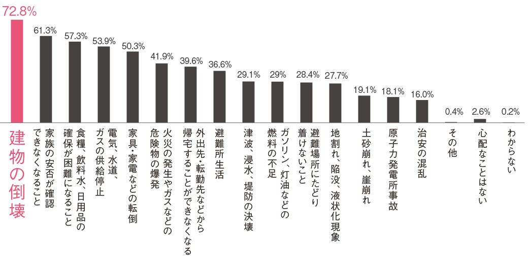 出典:「防災に関する世論調査」(内閣府)平成29年11月調査、地震対策に関する意識、大地震が起こった場合に心配なこと、複数回答。