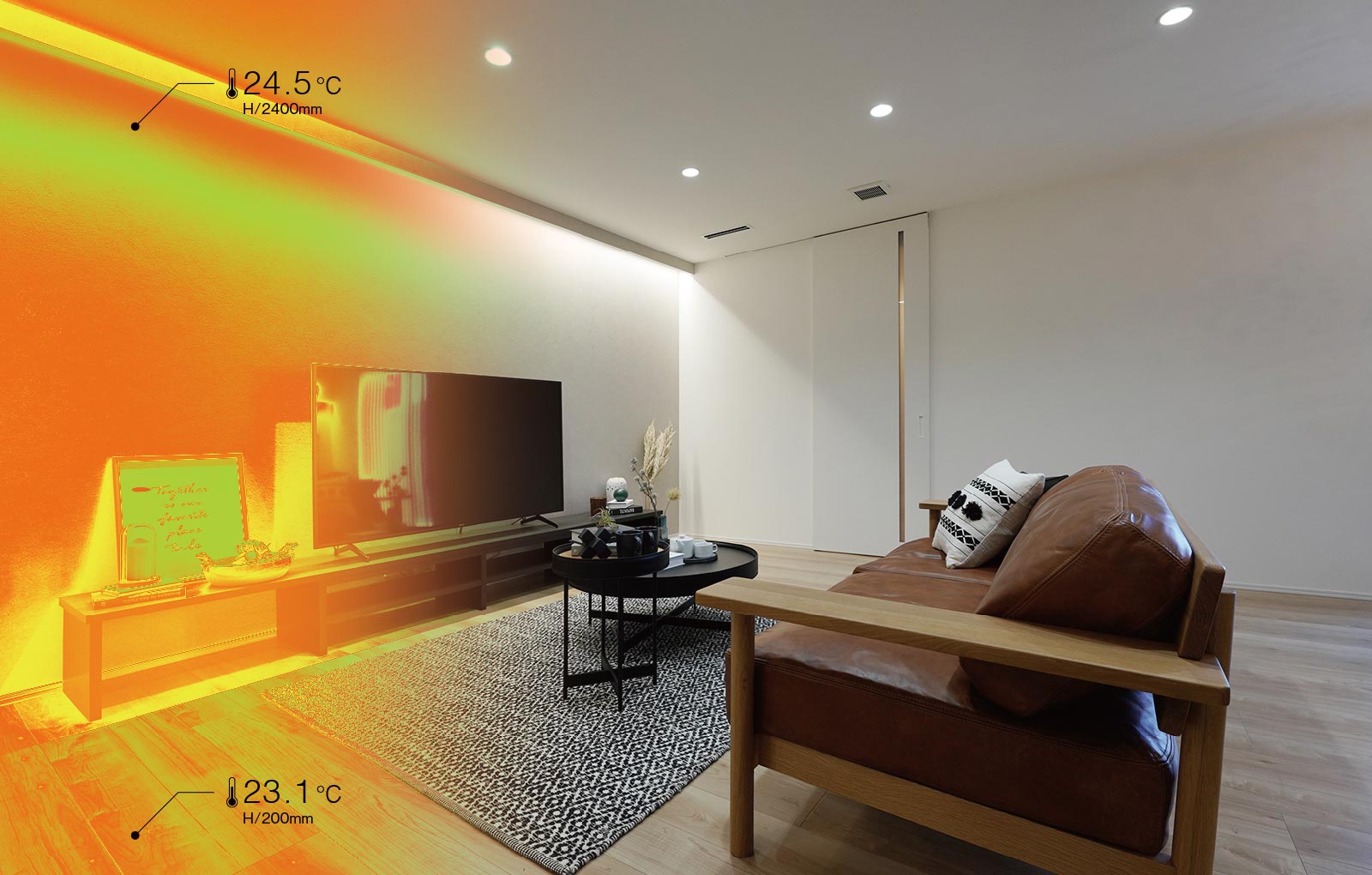 高断熱と全館空調により、部屋の上下の温度差の少ない家に。暖房を効かせると顔はほてり、足元は寒いままといったことがなく、部屋全体が均一に暖まります。