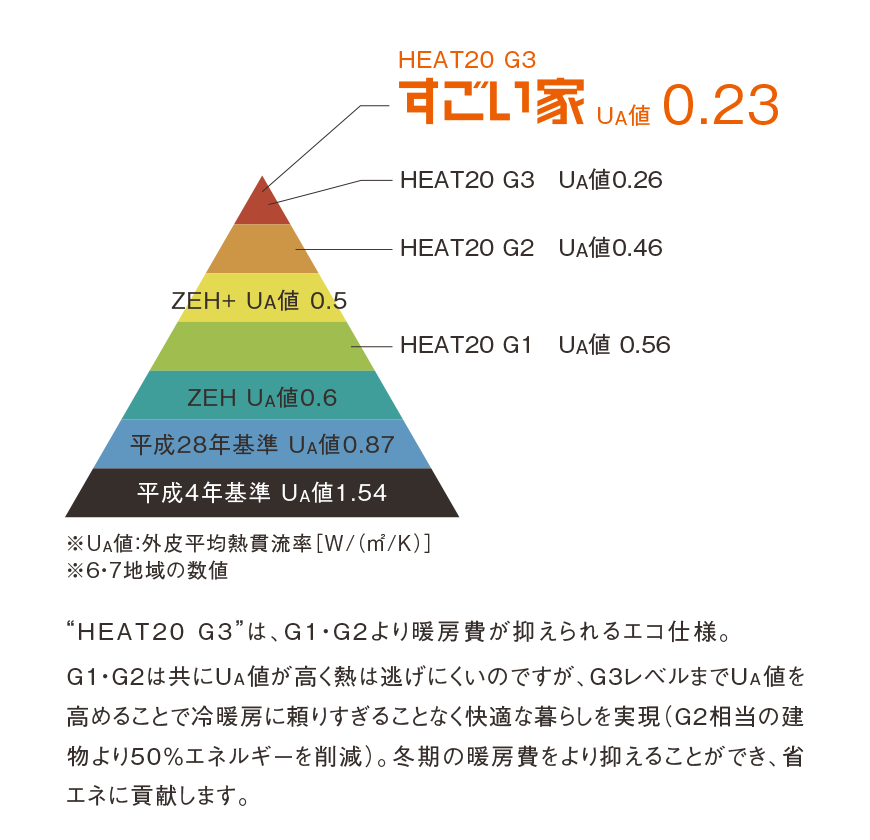 平成28年の省エネ基準やZEH適合基準の上をいく“HEAT20”の最高グレードとなるG3の断熱性能基準をクリア。熱の逃げにくさを示すUA値がG3基準の0.26W/㎡•Kのさらに上をいく0.23W/㎡•Kを実現しました。