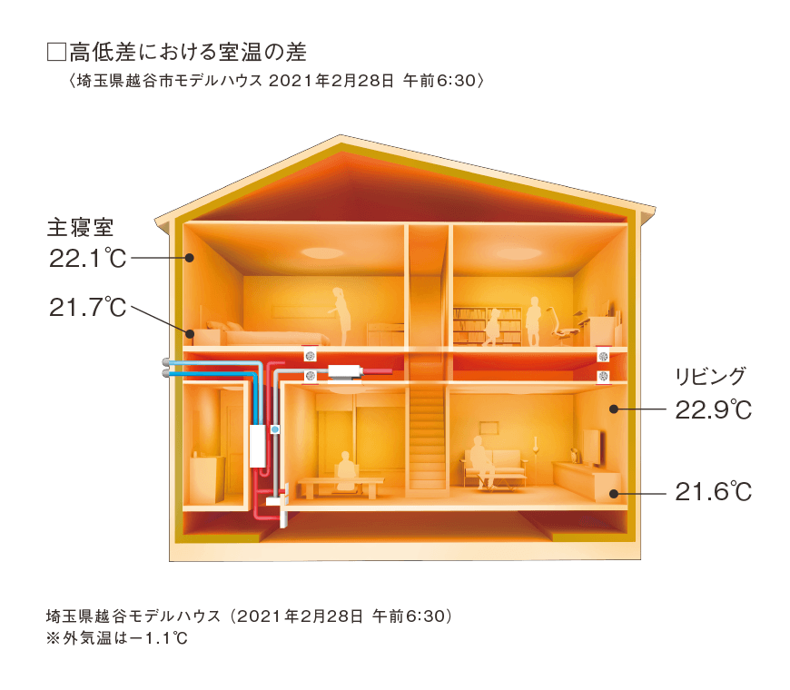 全館空調と高断熱性能で、部屋間や部屋の上下の温度差を解消。
