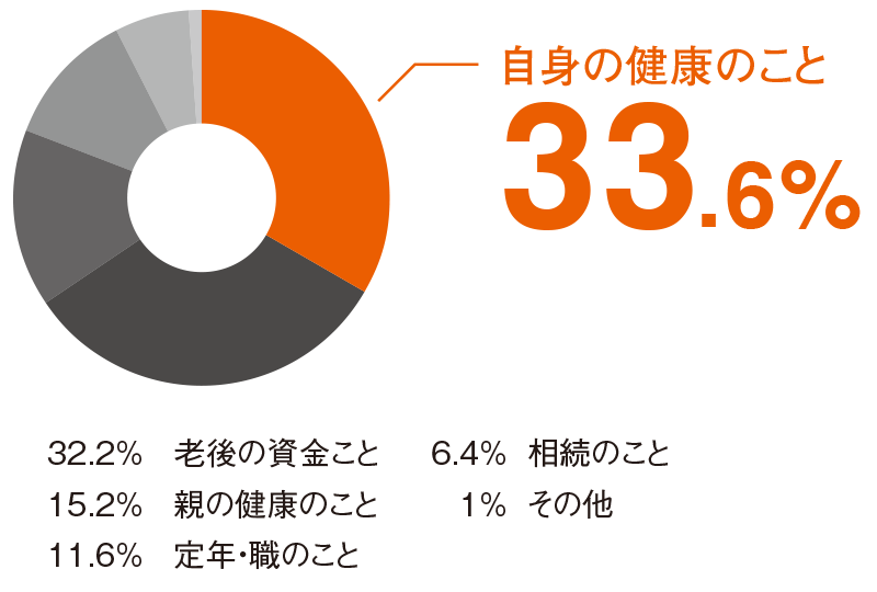 33.6%の割合で「自身の健康のこと」が第1位に。経済的なことよりも、ご自身やご家族の健康への関心が高いという結果になりました。