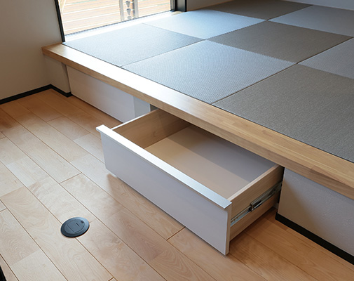 玄関横に設けた収納を兼ねたベンチは、当初は足の悪いゲスト用にと考えられていましたが、ご家族にとっても使い勝手が良いそう。「買い物帰りに一時的に荷物を置いたり、子どもを座らせて靴を履かせたり。自分たちも靴の脱ぎ履きがラクになりました」と奥様もお喜びのご様子です。