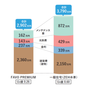 建築費は高めですが、金利が339万円から237万円に、光熱費が429万円から143万円に削減できることが試算されており、長期的には大きなコスト削減が期待できます。さらに、維持管理費も低減されるため、大きな経済的メリットがあります。