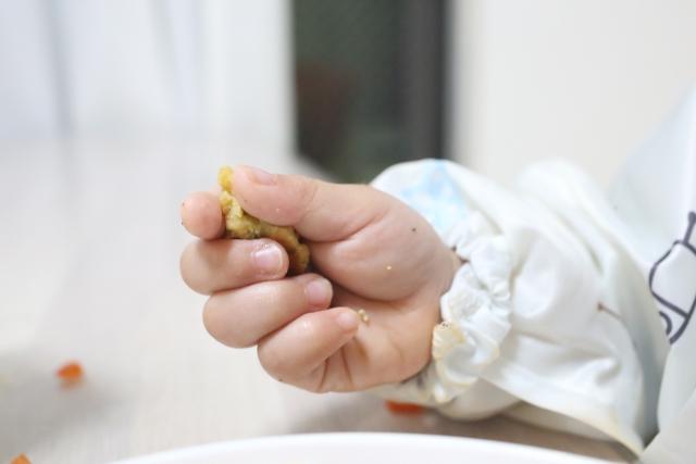 手づかみ食べは、食べ物を手指で「つかんで離す」動作が必要です。