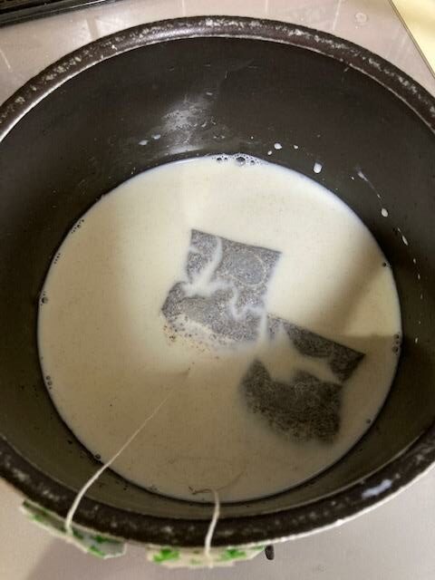 - 別の鍋に豆乳とティーバッグを入れ、しっかり煮出す